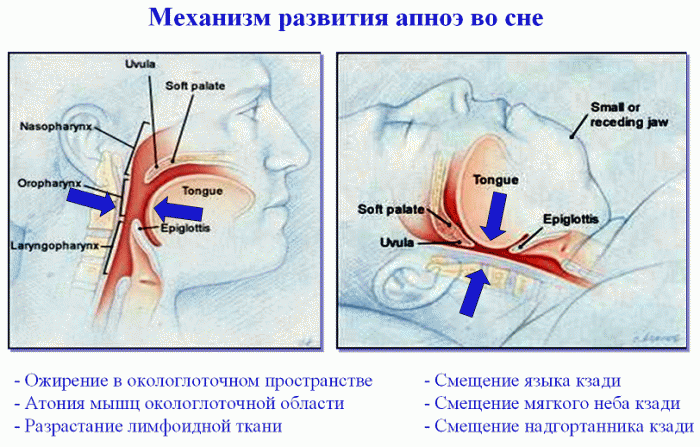 Причиной заболевания является частичное или полное перекрытие просвета дыхательных путей во время сна со снижением (гипопное) или полной остановкой дыхания (апное) на время от 10 секунд до 1 минуты. Причиной перекрытия (обструкции) дыхательных путей является смещение корня языка, небного язычка или надгортанника в сторону задней стенки глотки в положении пациента на спине.