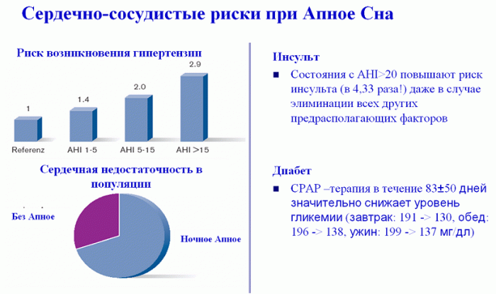 Плохой сон, прерываемый эпизодами апное и пробуждениями вызывает значительную дневную сонливость, утренние головные боли и повышение артериального давления. У пациента с нелеченным апное возникают нарушения памяти, концентрации внимания, снижается работоспособность. Резко повышаются риски аварий при управлении автомобилем или выполнении оперативной работы. При индексах апное свыше 20 в 4,5 раза возрастает риск развития мозгового инсульта, в значительной степени повышается вероятность развития сердечной недостаточности и сахарного диабета.