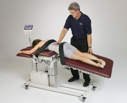 При этом переменная и постоянная тракция проводится применительно к 4 и 5 поясничным зонам. Ремни крепятся над подвздошной областью и на уровне нижних отделов грудной клетки. При проведении поясничной тракции ролики могут обеспечивать дополнительную флексию позвонков, исключающую искривление позвоночника. Стул для ног помогает сгладить поясничный изгиб и правильно позиционировать пациента. Тракция может проводиться в положении на боку и с ротацией.