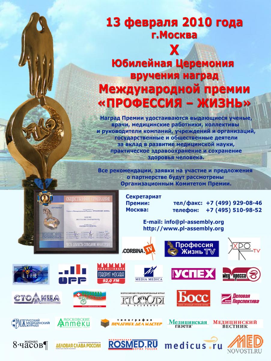 13 феврая 2010 года в в Концертном Зале Гостиницы «Космос» состоится 10-ая Юбилейная церемония вручения наград Международной премии "Профессия Жизнь"