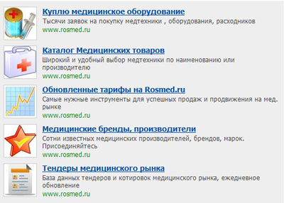 Блок из 5-ти текстовых баннеров показывается внизу всех страниц 2-х медицинских порталов Rosmed.ru и Rusmed.ru тем самым обеспечивая максимально точную аудиторию Вашей компании, товарам и услугам.