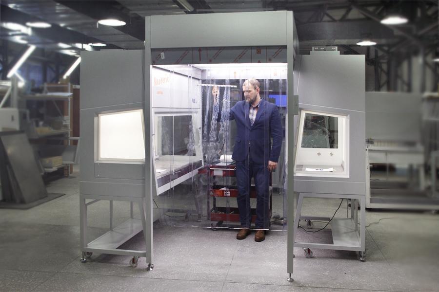 Проработав различные варианты, специалисты ЗАО «Ламинарные системы» предложили «вписать» между боксами микробиологической безопасности чистую зону 5 класса, которая обеспечивала бы стерильность рабочей зоны и защиту от перекрестной контаминации с помощью фильтрованного ламинарного воздушного потока. Но, чтобы гарантировать Заказчику результат и убедиться, что одновременно работающие боксы 2 класса не повлияют на однородность нисходящего воздушного потока в чистой зоне, специалисты предприятия собрали конструкцию из двух боксов микробиологической безопасности 2 класса и чистой зоны прямо на сборочном производстве. А затем визуализировали воздушный поток с помощью парогенератора (см. видео).