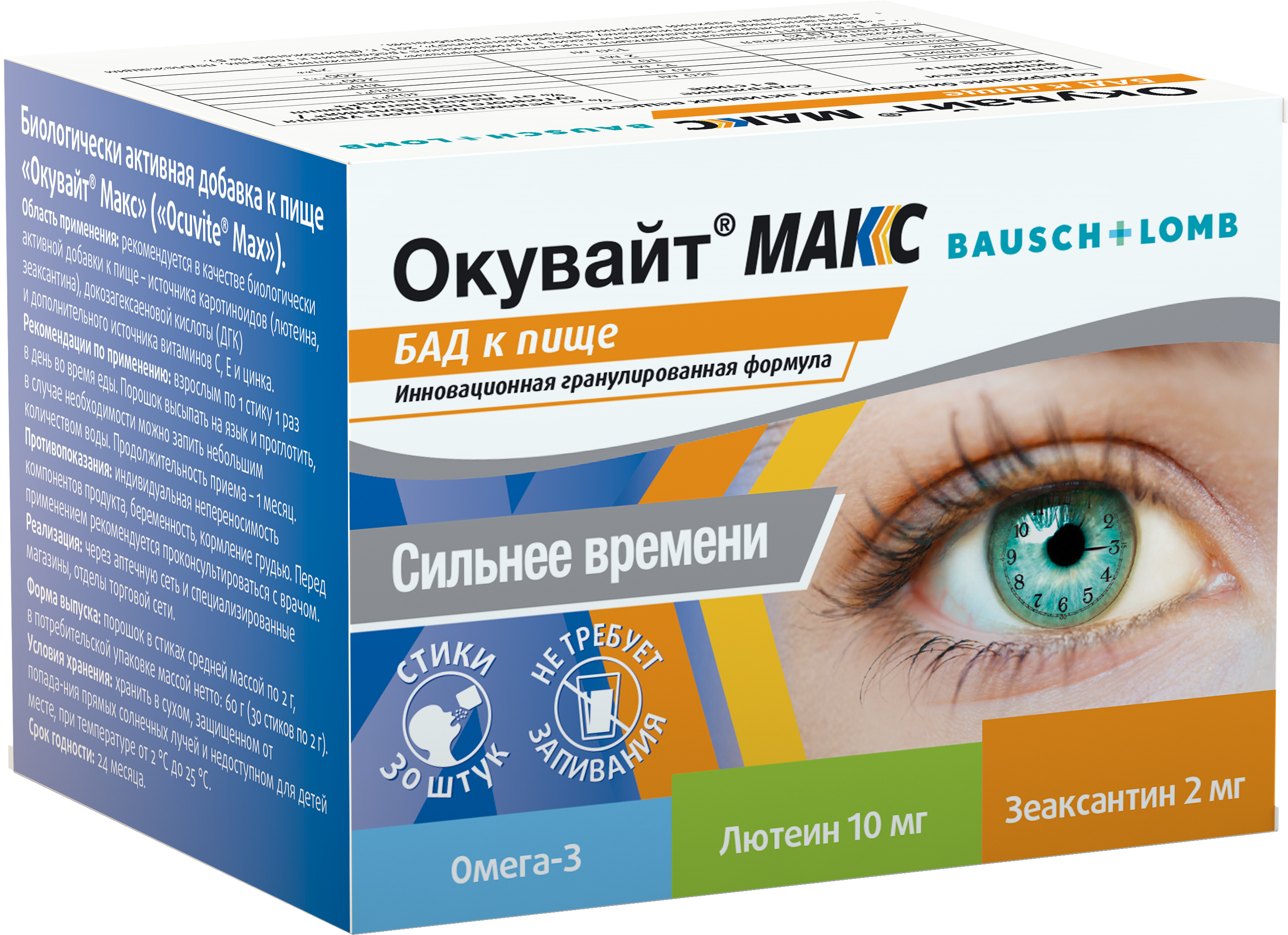 Компоненты «Окувайт® Макс» не вырабатываются организмом и рекомендованы для включения в ежедневный рацион питания. Содержащиеся в составе продукта каротиноиды способствуют защите сетчатки от разрушающего воздействия яркого света, снижают риск возникновения и развития возрастных дегенеративных изменений сетчатки и обладают антиоксидантными свойствами3.
