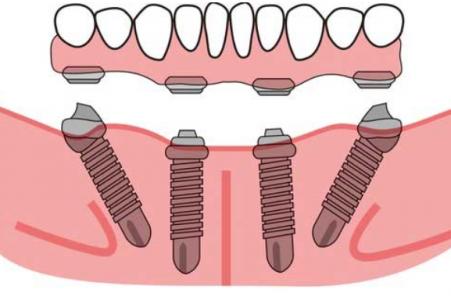 Врач проводит удаление оставшихся зубов (если они есть) и установку четырех имплантатов в челюсть под местным наркозом. Процедура длится около двух часов.
