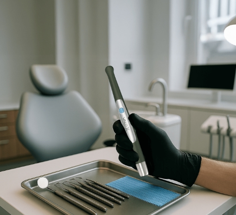 Сердцем любой композитной пломбы, винира, цемента для брекетов или корневого штифта является фотоинициатор, чаще всего камфорохинон. Этот компонент активируется светом определенной длины волны (обычно в синем диапазоне около 460-480 нм). Поглощая фотоны света, инициатор распадается на радикалы, которые запускают цепную реакцию полимеризации жидкого мономера. В результате за считанные секунды материал превращается из пластичной массы в твёрдый, высокопрочный полимер. Таким образом, лампа служит «ключом», запускающим этот процесс, и от её эффективности напрямую зависят окончательные физико-механические свойства реставрации: прочность, износостойкость, краевая герметичность и цветостабильность.