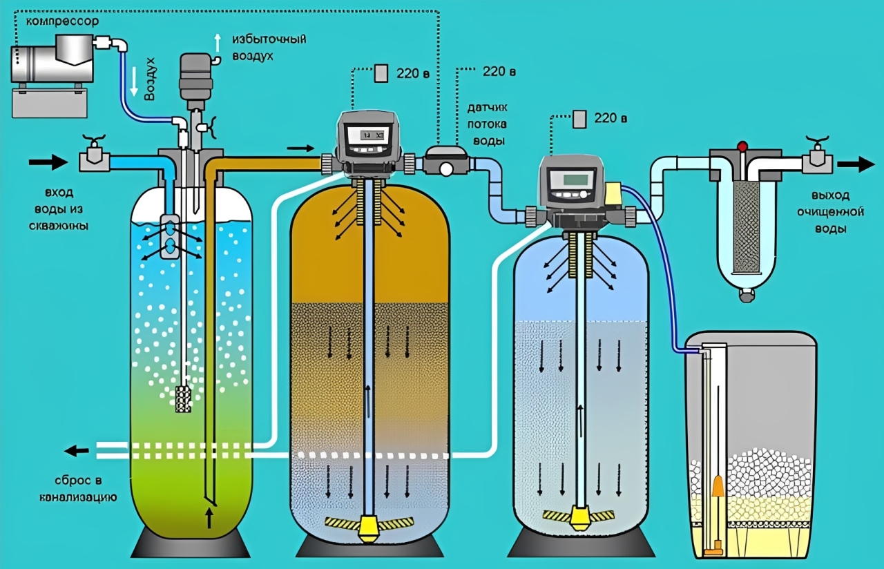 После забора вода направляется на этап предварительной обработки, где удаляются взвешенные и грубодисперсные примеси. Первым барьером служат сетчатые или дисковые фильтры с размером ячейки от 100 до 300 микрон, задерживающие песок, частицы глины и ржавчину. Затем вода проходит через многослойные песчано-антрацитовые фильтры, эффективность которых достигает 95 процентов по удалению механических включений размером свыше 20 микрон. При повышенной концентрации железа применяется аэрационная колонна, где кислород окисляет двухвалентное железо до трёхвалентного, после чего оно выпадает в осадок и удаляется фильтрацией. Согласно исследованиям Института водных проблем РАН, содержание железа в исходной воде часто превышает норму в 3-5 раз, особенно в центральных и северо-западных регионах России. Для снижения жёсткости, вызванной кальцием и магнием, используются ионообменные фильтры или реагентная обработка пищевой содой. Этот этап занимает от 30 минут до 2 часов в зависимости от загрязнённости и является обязательным перед подачей воды на мембранные системы, так как крупные частицы могут повредить дорогостоящие мембраны.