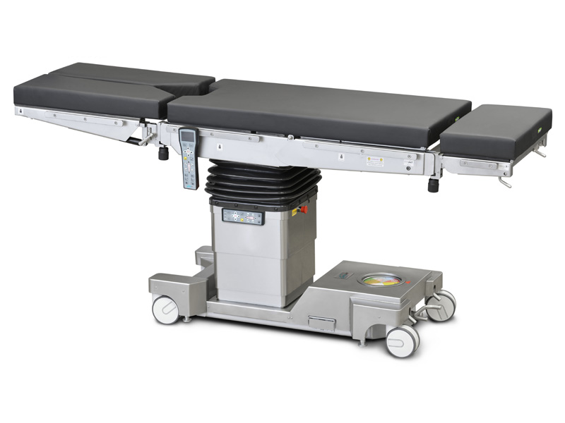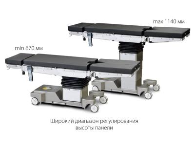 Это многофункциональный операционный стол, который отвечает всем строгим требованиям современной хирургии. Он надежен и удобен для пользователей. Сконструирован с учетом потребностей и рекомендаций практикующих хирургов. Имеет расширенный диапазон регулировки высоты панели. Низкое опускание панели оптимально при проведении длительных операций, требующих низкого позиционирования. Продольный сдвиг до 320 мм обеспечивает отсутствие «мертвых зон» при проведении рентгенографии. Перестановка местами головной и ножной секций в сочетании с продольным сдвигом обеспечивают рентгенопрозрачную консоль 1525 мм. Предусмотрена функция "нулевого" положения панели с возможностью экстренной остановки. Управление всеми функциями стола производится с помощью ручного пульта или дублирующего пульта на колонне. Возможно управление с помощью ножного педального блока управления (опция).