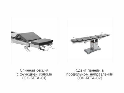 ОК-БЕТА – это универсальный, простой в управлении операционный стол. Может использоваться в медицинских центрах, областных, городских больницах, как при проведении операций общей хирургии, так и для специализированных операций с применением дополнительных комплектов приспособлений, выпускаемых предприятием.