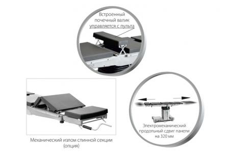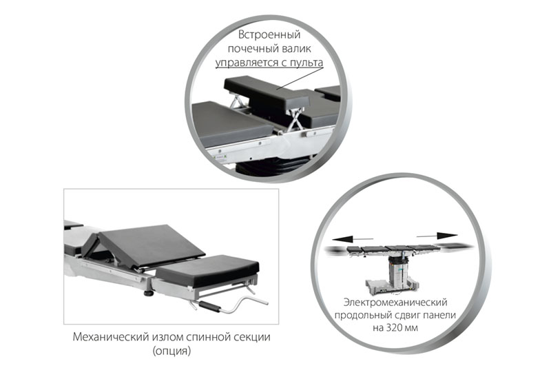 Панели общехирургических столов ОМ-ДЕЛЬТА имеют встроенные подъемные почечные валики, управляемые с пульта. Спинная секция в столах ОМ-ДЕЛЬТА-02 имеет функцию механического излома, управляемого съемной рукояткой.