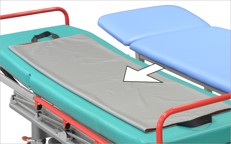 Две поверхности устанавливают рядом на одной высоте. Повернув перекладываемый объект на бок, частично подкладывают под него перекладчик. Затем объект возвращают в исходное положение.