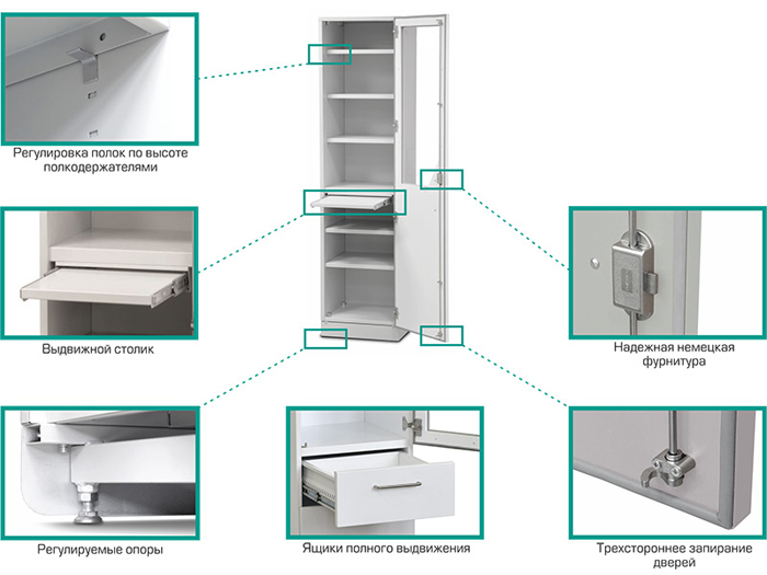 Двухстворчатый шкаф предназначен для хранения медикаментов, лекарственных препаратов, инструмента, перевязочных материалов в больничных отделениях, поликлиниках, медицинских пунктах, аптеках. Верхняя часть шкафа имеет двери со стеклом. Нижняя часть шкафа оборудована ящиками полного выдвижения.