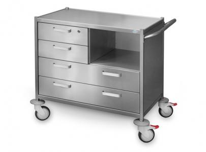 Столик имеет 4 легко выдвигаемых ящика, один из которых с замком повышенной секретности. Столик изготовлены из нержавеющей стали. По желанию заказчика фасады из нержавеющей стали могут быть окрашены высококачественными полимерными красками в соответствии с цветовой картой предприятия.