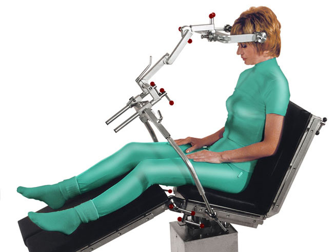 Позиционирование головы обеспечивается либо жесткой фиксацией, либо с использованием профилированного подковообразного подголовника.
