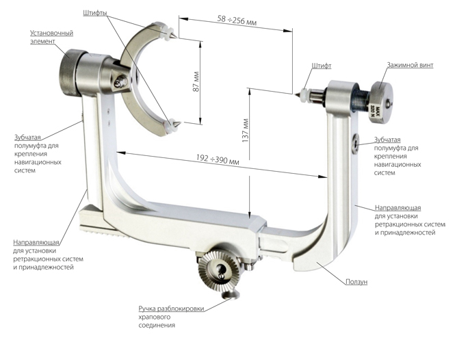 Комплект приспособлений для нейрохирургии позволяет жестко и точно фиксировать голову при проведении нейрохирургических операций в лобной, затылочной, височной или теменной области с размещением пациента «лежа» или «сидя».