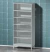 Шкаф металлический AR-77 AR-77 изготавливается из стали листовой и покрывается полимерным покрытием (200 цветов), стандартный цвет белый (RAL 9003) количество выдвижных ящиков 8 и одна распашная металлическая дверь с двумя стеклянными полками. Комбинируя модули можно