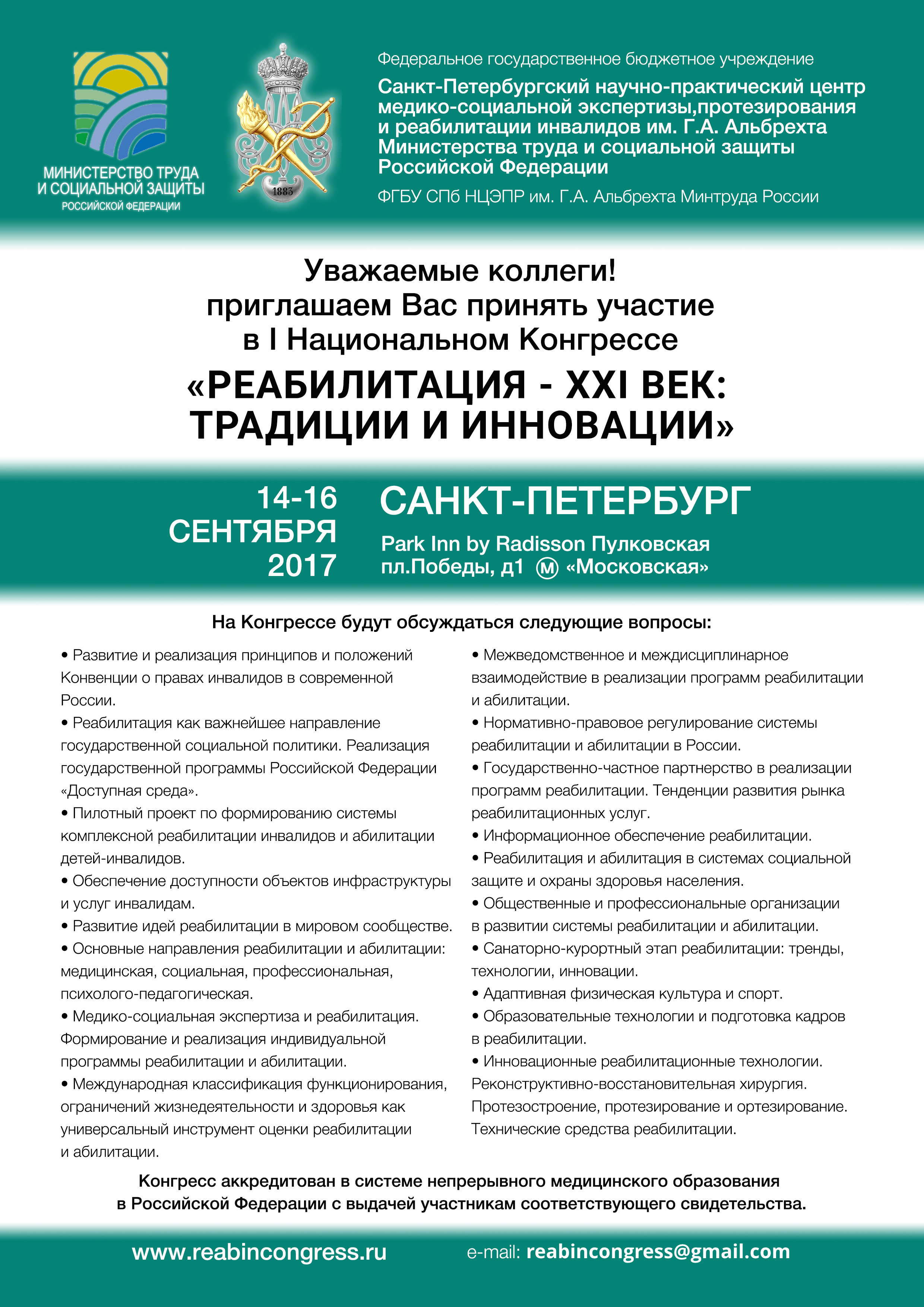 14-16 Сентября 2017 Санкт-Петербург, гостиница Park Inn by Radisson Пулковская, площадь Победы, д.1 (ст. Метро «Московская») Россия, Санкт-Петербургi_nacionalnyi_kong...png Организатор: Министерство Труда и социальной защиты Российской Федерации, Федеральное государственное бюджетное учреждение «Санкт-Петербургский научно-практический центр реабилитации инвалидов им. Г.А. Альбрехта» Министерства труда и социальной защиты РФ. +7 812 544 13 26 | I Национальный конгресс «Реабилитация – ХХI век: традиции и инновации»Участие в Конгрессе – это уникальная возможность пообщаться с представителями государственных структур, экспертами по социальной, медицинской, психологической реабилитации инвалидов, познакомиться с новинками рынка протезирования, медицинской техники и средств для реабилитации. На Конгрессе будут обсуждаться следующие вопросы: • Развитие и реализация принципов и положений Конвенции о правах инвалидов в современной России. • Реабилитация как важнейшее направление государственной социальной политики. Реализация государственной программы Российской Федерации «Доступная среда». • Пилотный проект по формированию системы комплексной реабилитации инвалидов и абилитации детей-инвалидов. • Обеспечение доступности объектов инфраструктуры и услуг инвалидам. • Развитие идей реабилитации в мировом сообществе. • Основные направления реабилитации и абилитации: медицинская, социальная, профессиональная, психолого-педагогическая. • Медико-социальная экспертиза и реабилитация. Формирование и реализация индивидуальной программы реабилитации и абилитации. • Нормативно-правовое регулирование системы реабилитации и абилитации в России. • Международная классификация функционирования, ограничений жизнедеятельности и здоровья как универсальный инструмент оценки реабилитации и абилитации. • Межведомственное и междисциплинарное взаимодействие в реализации программ реабилитации и абилитации. • Государственно-частное партнерство в реализации программ реабилитации. Тенденции развития рынка реабилитационных услуг. • Информационное обеспечение реабилитации. • Реабилитация и абилитация в системах социальной защите и охраны здоровья населения. • Общественные и профессиональные организации в развитии системы реабилитации и абилитации. • Санаторно-курортный этап реабилитации: тренды, технологии, инновации. • Адаптивная физическая культура и спорт. • Образовательные технологии и подготовка кадров в реабилитации. • Инновационные реабилитационные технологии. Реконструктивно-восстановительная хирургия. Протезостроение, протезирование и ортезирование. Технические средства реабилитации. Конгресс аккредитован в системе непрерывного медицинского образования в Российской Федерации с выдачей участникам соответствующего свидетельства. |