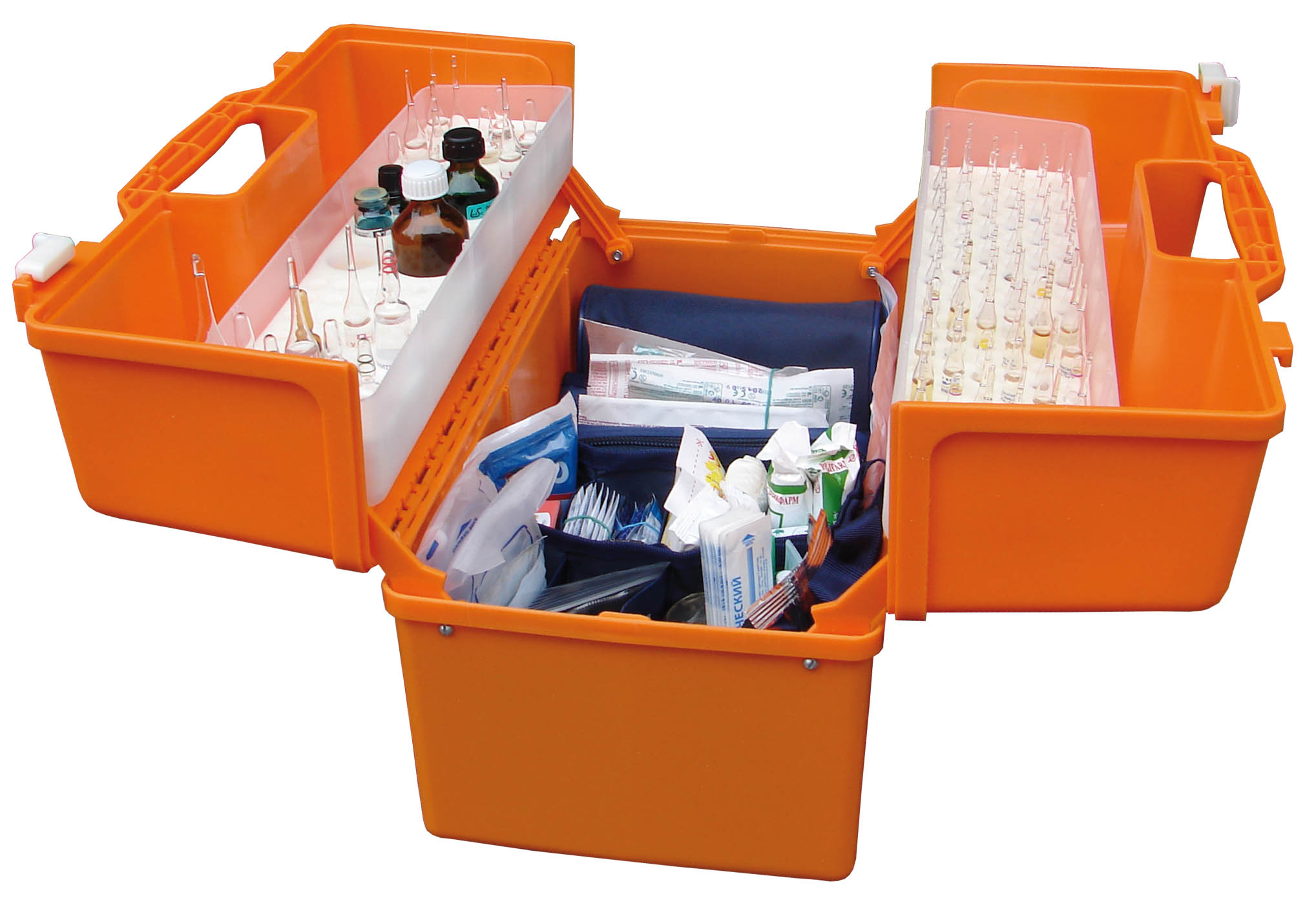 Серия УМСП-1-Пм/2 представляет собой пластиковые саквояжи из высокопрочного пластика, снабженные перегородками, вкладышем-ячейкой и ложементами под ампулы, обеспечивающими удобство размещения всего перечня медицинский изделий и лекарственных средств. Липкая аппликация с наименованиями лекарственных средств, поможет определить место каждому лекарству и без труда ориентироваться в ампулах.