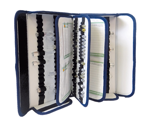 Описание: Тканевые ампульницы представляют собой футляр из водоотталкивающей синтетической ткани ПВХ. Конструкция ампульницы имеет жесткий каркас для защиты ампул от ударов и внутренние перегородки для защиты ампул от взаимного контакта. Каждая ампула укладывается в индивидуальную ячейку из эластичной тесьмы. Внутри ампульницы имеются карточки-вкладыши для подписи лекарственных средств.