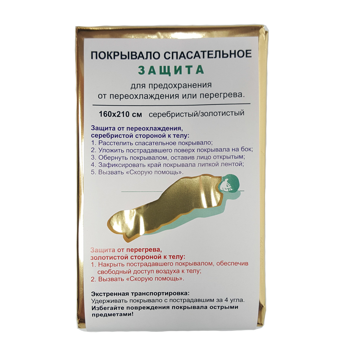 Покрывало спасательное "Защита" (160 х 210 см), РоссияУпаковка 200штПрименение спасательных покрывал (спасательных одеял):Помимо основного назначения покрывал (использование в аптечках первой медицинской помощи), существует множество полезных и удобных альтернативных вариантов применения этой продукции.Любителям экстремального туризма, спасательное покрывало будет полезным как в обычных, так и в экстренных ситуациях.Лесникам и людям увлекающимся самостоятельными путешествиями и походами, термозащитное отражающее покрытие покрывала, не даст замёрзнуть в холод или защитит от солнца. Позволяет ночевать на сырой земле, благодаря своим изотермическим свойствам.Спасательное покрывало сохранит продукты на длительный срок при высокой внешней температуре. Горячие продукты, надолго останутся тёплыми, а холодные сохранят низкую температуру при сильной жаре.Вы можете завесить покрывалом окно автомобиля или окна солнечной стороны квартиры и внутри помещения сохранится прохлада.Грузоподъёмность до 200кг, даёт возможность использовать его как носилки. Однако несколько носилок в карман не положишь, а размер упаковки спасательного покрывала составляет лишь 14 х 8 х 1 см!Поскольку спасательные покрывала изготавливаются медицинским производителем, они имеют бактерицидное покрытие, что даёт возможность безопасного контакта с ожогами и ранами.Применение спасательных покрывал, более десятка лет распространено во всех странах мира. Его компактность, лёгкость и универсальность использования, делает его незаменимой вещью в совершенно различных жизненных ситуациях. От простейшего бытового удобства, до спасения жизни.Спасательные покрывала могут применяться при наводнениях, ДТП, авариях на производстве, пожарах и любых чрезвычайных ситуациях.