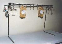 Стойка медицинская состоит из двух металлических кронштейнов с перекладиной, на которой закреплены крючки для подвески пластиковых контейнеров для заготовки крови. На каждом из кронштейнов могут дополнительно крепиться держатели флаконов (по два флакона с каждой стороны), поставляемые по желанию заказчика.