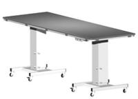Кушетка медицинская универсальная электроподъемная представляет собою ложе из материала прозрачного для рентгеновского излучения, установленное на двух штативах. Основание штативов представляет собой устойчивые платформы с 4-мя колесами, причем у каждого штатива одно из колес стопорное, что позволяет, при необходимости, легко перемещать кушетку либо обеспечивать ее неподвижность. Стойки штативных платформ имеют наружные кожухи с поперечными размерами120-150 мм, произвольной формы. В стойках расположены подъемный и фиксирующий электрические механизмы, позволяющие изменять высоту положения ложа, а также устанавливать ложе под углом к горизонту. Пульт управления, располагающийся с краю под ложем, позволяет приводить в действие подъемные механизмы обоих стоек одновременно или по отдельности. В конструкции штативов обеспечена предельно высокая жесткость и устойчивость, что придает эти свойства и всей конструкции кушетки. Кушетка комплектуется съемным матом, укладываемым на ложе и крепящимся к нему с тыльной стороны.